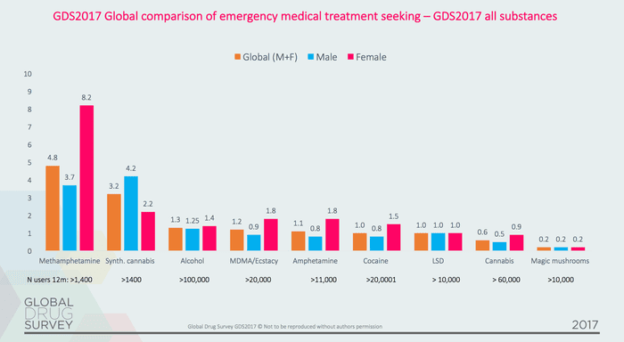 Of the almost 10,000 LSD consumers who took part in GDS 2017, around 1% of them – 95 individuals – reported seeking emergency medical treatment, five times more than those who took magic mushrooms.